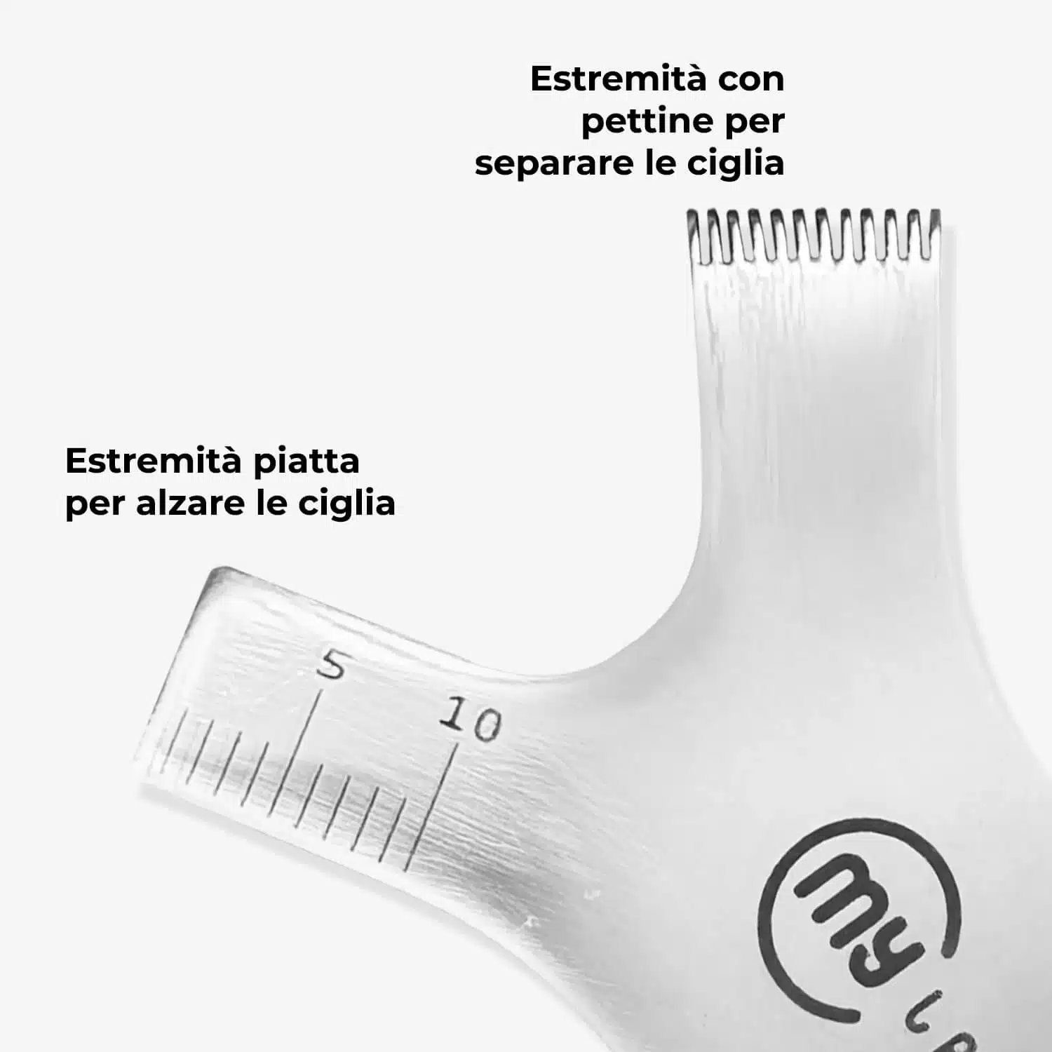 - Getande zijde – voorzien van fijne tandjes om wimpers en wenkbrauwen te kammen, scheiden en uitlijnen voor een strak en symmetrisch resultaat